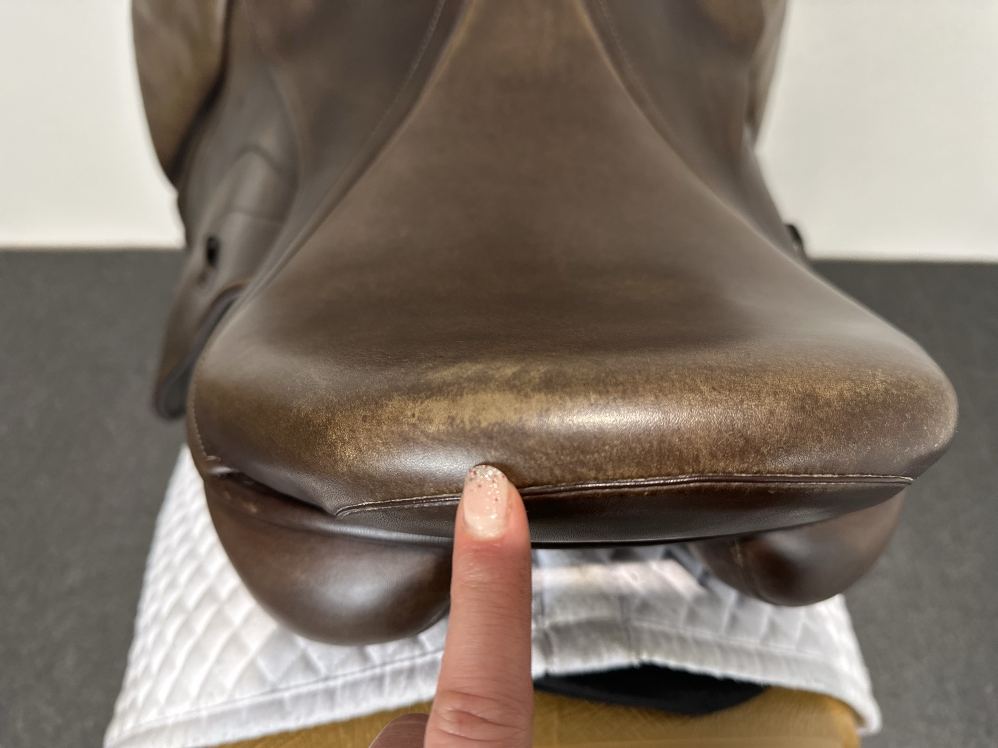 Once the saddle has been used once or twice, most of this colour loss should disappear, unless the saddle surface has been made ‘damp‘ after cleaning.